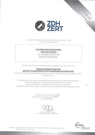 Das BDB Markenzeichen ist von der LGA Intercert und vom TÜV Rheinland am 24. April 2009 nach DIN EN ISO 9001:2008 zertifiziert worden. Diese Zertifizierung ist deshalb besonders hochwertig und für die Auswahl des Bestatters aussagekräftig, weil sie auch die DIN EN 15017 – Bestattungsdienstleistungen – und die Satzung zum Markenzeichen des Bundesverbandes Deutscher Bestatter e.V. mit den dort niedergelegten strengen Anforderungen zugrunde legt.